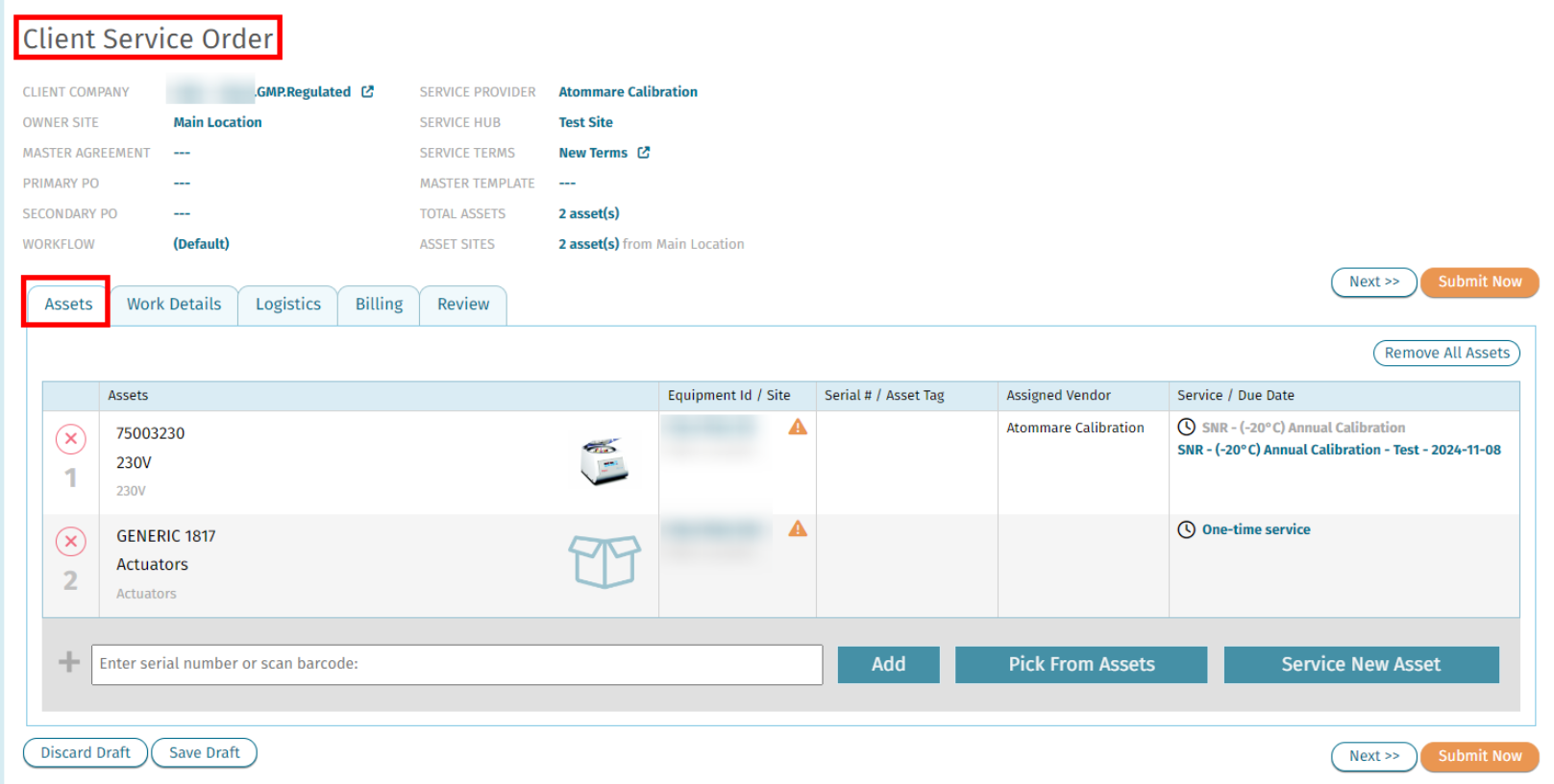 - Add Additional Assets: You can add assets by serial number, selecting from a list, or entering new asset details.