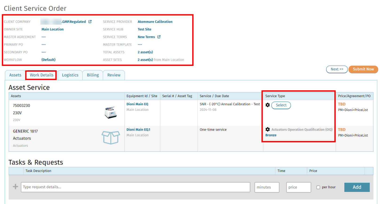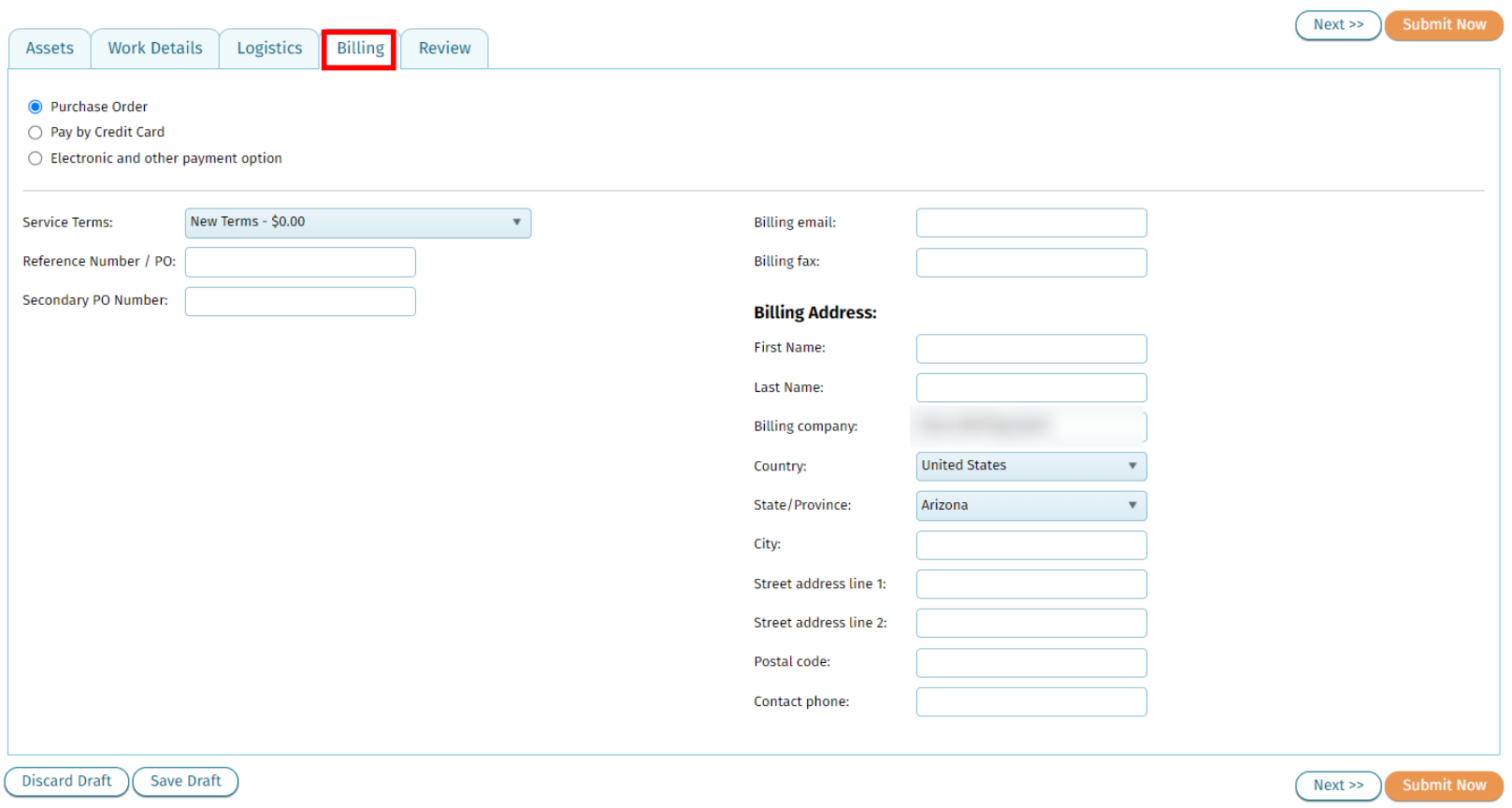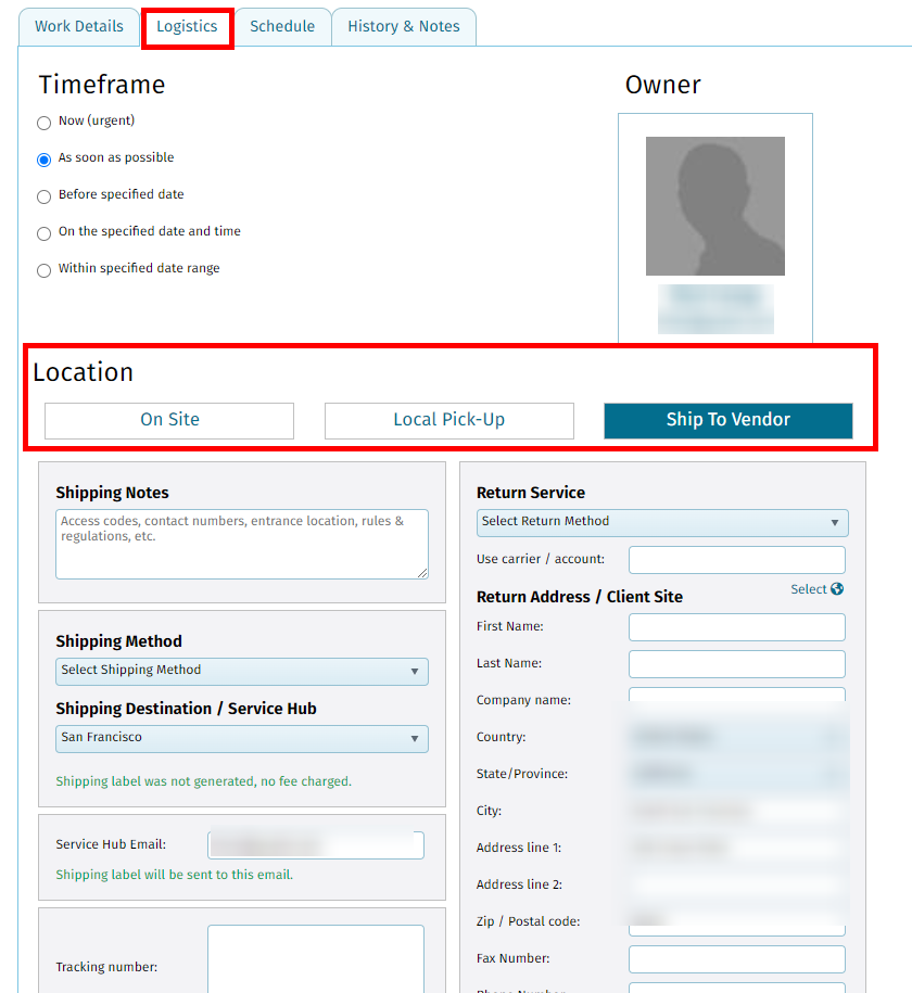 Add Additional Requests: Add special instructions for the technician. Click Next to continue to the Logistics tab.