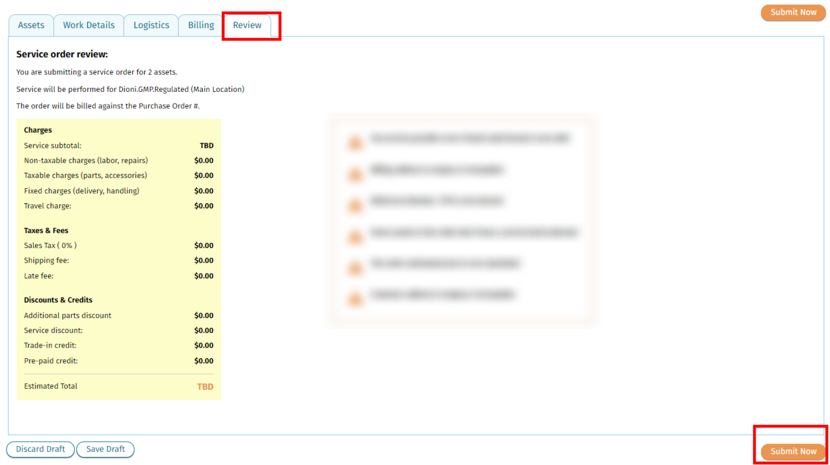 Adjust the Estimated Total: If pricing is missing (displayed as TBD), override it by clicking the pricing link and entering the appropriate values for service, parts, or labor.