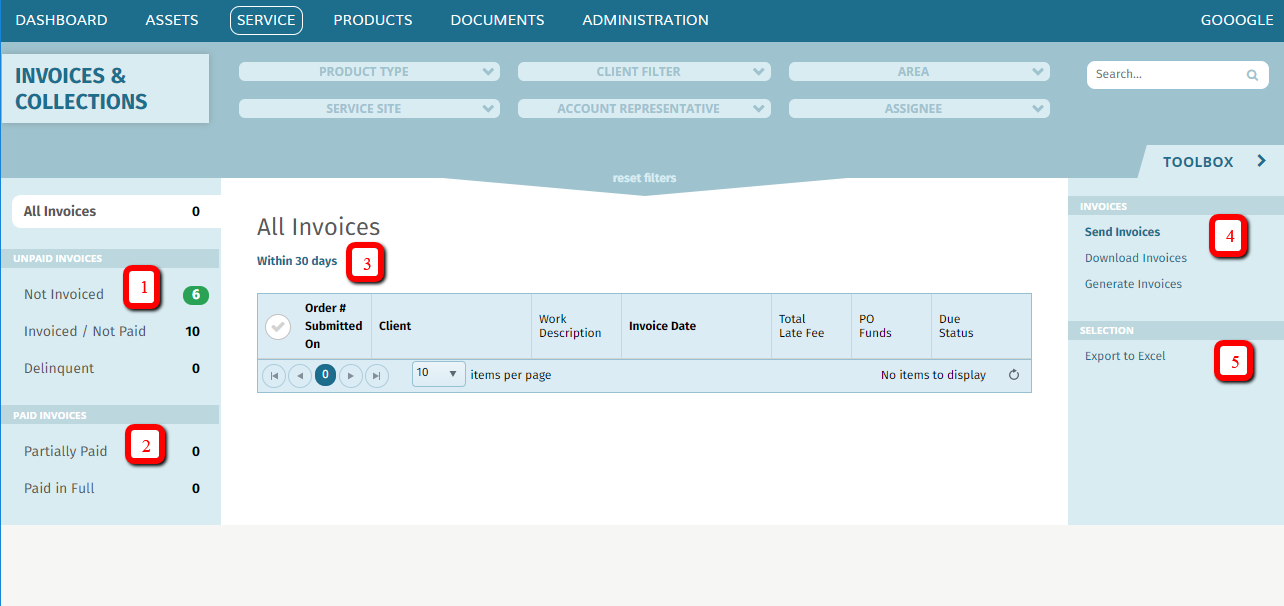 First, hover over SERVICE in your top navigation bar > click "Invoices & Collections"