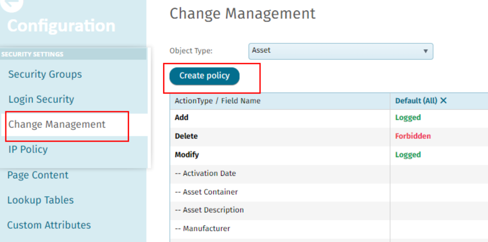 - Logged + Reason: Change is tracked and requires a reason from the user.