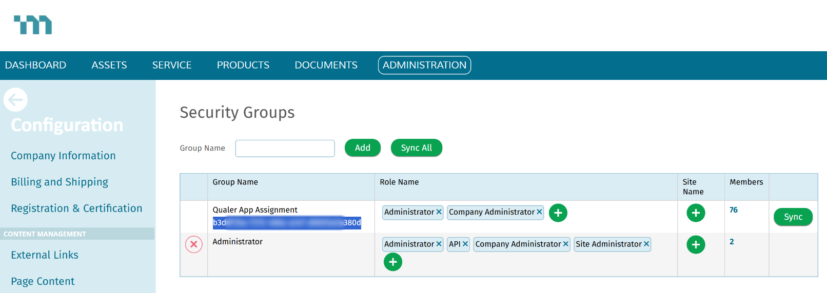 - Verify sites/roles/permissions assigned to the group in Qualer Web
